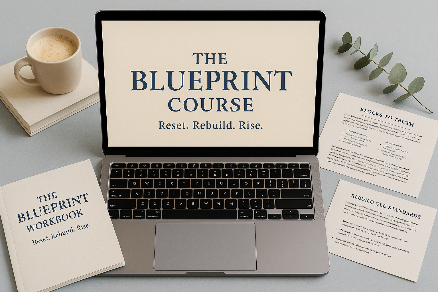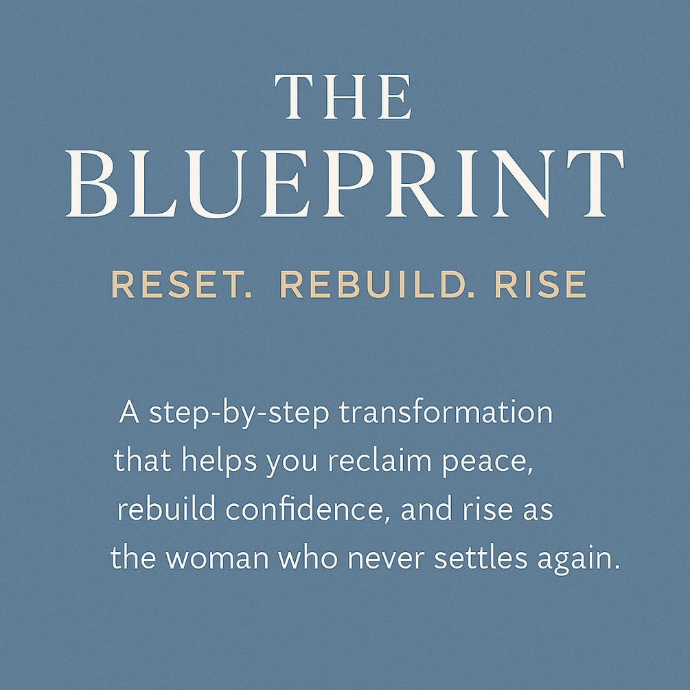 The Blueprint: Reset. Rebuild. Rise. A step-by-step transformation that helps you reclaim peace, rebuild confidence, and rise as the woman who never settles again. Inside The Blueprint you’ll discover the process to heal emotionally, redefine your standards, and create alignment in every area of your life. Each phase includes reflection prompts, challenges, and bonus toolkits designed for real transformation.